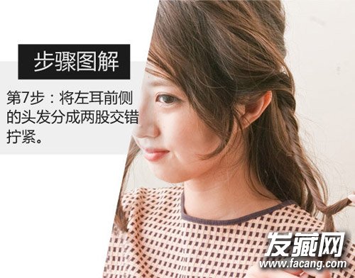 第7步:将左耳前侧的头发分成两股交错拧紧。