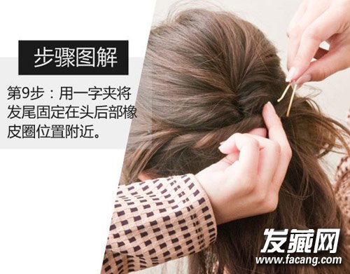 第9步:用一字夹将发尾固定在头后部橡皮圈位置附近。