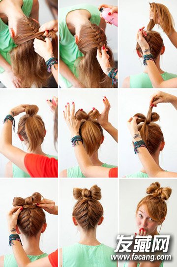1、将头发倒过来编鱼骨辫至头顶,为了避免碎发过于毛躁,可喷一点定型啫喱。