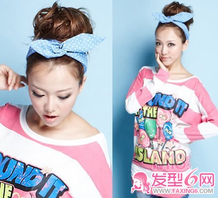 非常适合中长发的日系春季发型——将所有头发在头顶扎成发束,然后根据发量的多少不同选择分成4-6份,朝不同方向向下弯曲并用发卡固定,用发胶帮助定型,做成大大的花苞大丸子头,清爽又可爱。搭配一条方巾做发箍收服刘海碎发,颜色淡雅的小圆点印花款式很萌哦!