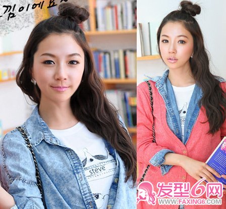 不想太幼稚、希望保留原有的波浪长卷发型,可以在披散的长发基础上,利用丸子发型来作出一点新改变——将顶发在一侧头顶歪扎成可爱的小丸子,为淑女长发增加一点趣味感,大人气的卷发立刻成功减龄!