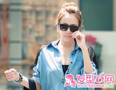 名媛气质的韩式盘发,集中头顶的发丝,露出漂亮的额头,乌黑的墨镜,搭配黑色的衣衫,韩范尽显。