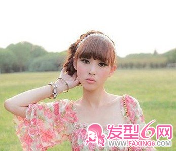 发靓 丽纯 净的精致盘发,精心设计的后部发髻,配搭前面的厚刘海,可爱抢眼,紧紧固定头顶的发箍,让发型更加有味道。