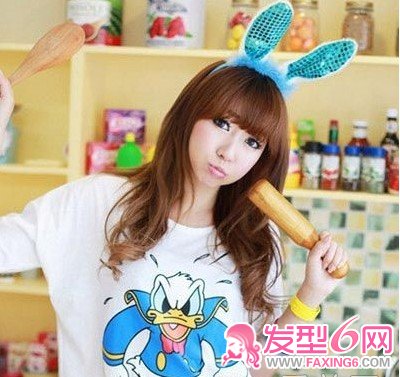 卡通style的可爱学生发型,柔美的乖巧女生卷发,整齐的刘海,蓝色兔子头饰,灵动卡哇伊的萌萌女孩味道。