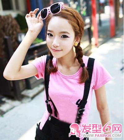 双马尾辫子发,在耳边后面扎起,干净清爽,露出额头的造型,令显活泼动感的青春气息。
