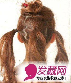 第二步 卷完后将头发分区,如图所示,分成4份。头顶部分先用夹子夹好,下面3束马尾用橡皮筋扎好。