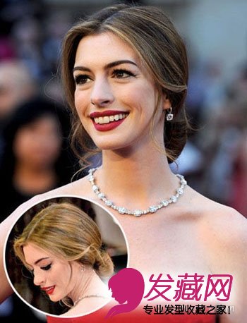 还觉得低发髻看上去老气横秋?看看Anne Hathaway在今年81届Oscar上的表现吧!身为主持人的她不仅在现场恶搞,机智的表现令人称赞,红毯上一袭红裙搭配的扇形低发髻,也非常有借鉴价值。