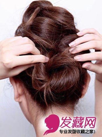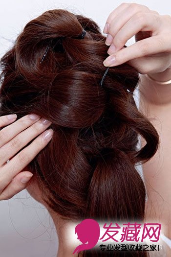 4 同样的方法做完第四个区,将每个区马尾的发梢分别拧紧后别在藏在盘好的发髻中用发卡固定。个别的碎发可以整理下纹理感后,再用发胶固定。