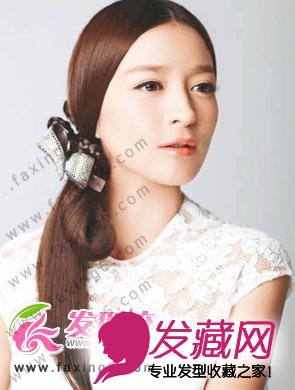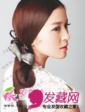 在一边耳朵下方扎马尾,去1/2发量的头发变成辫子缠绕在扎发部位,最后将马尾绕圈用缎带固定。