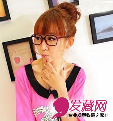 清爽活力,齐刘海丸子头盘发,可爱减龄,更显青春动感活力,戴上一副有很学生范的黑色边框眼镜,可爱养眼,很有活力少女的健康动力。