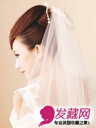 马尾变身术:将高高束起的马尾盘成发髻,固定在头顶处,再用头纱包裹住发髻,精致的马尾完美变身现代优雅古典的新娘look。