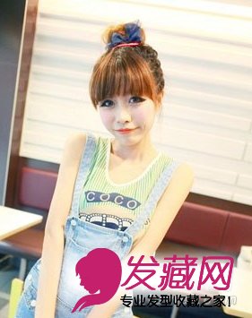 将丸子头扎向一侧的盘发发型设计,表现出甜美的气质,一款活力十足的发型设计,将给女生带来更多的青春动感气息,丸子头发型搭配牛仔连体裤,显得很休闲,发型百搭又呈现出时尚的味道。