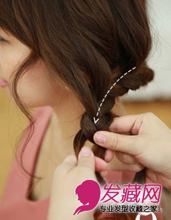 Step 5:到右边的时候,不要太紧,让耳际的头发松松地盖住耳朵,辫子沿着头发的方向继续编扎,直到尾部。