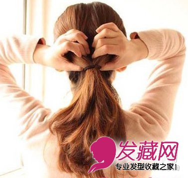 用橡皮筋把刚才收拢的三分之二头发扎起来,用手指在发束中掏出一个洞