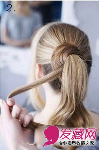 step2:将马尾用发圈固定后,从马尾中抽出一缕头发缠绕在发圈上。