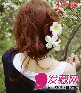 一款唯美的韩式盘发,白色花朵妆点的发型清新纯洁,偏红棕的发色兼顾时尚感与女性的柔美感。美丽优雅,气质出众。