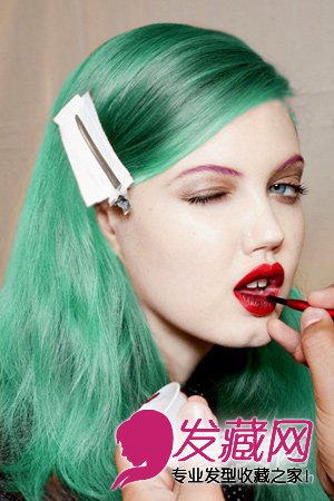 青绿色的染发本就十分夸张大胆,再配上鲜红的口红以及紫色的眉毛,五官不精致皮肤不白皙的女生绝对HOLD不住