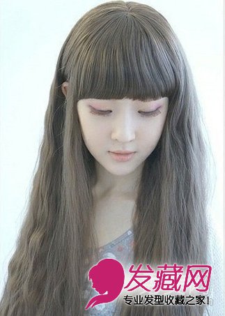亚麻灰色系染发,是不是非常像动漫里的卡哇伊少女呢?这款发色会显得肌肤非常的白皙,同时很有小清新的感觉。长长的卷发还有内卷的齐刘海,都可以很好的修饰脸型。