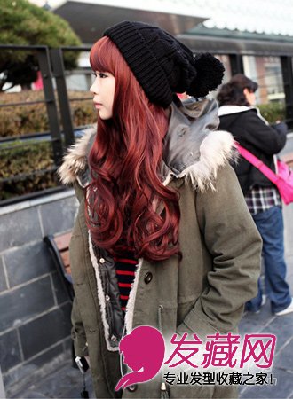 非常饱满的红色卷发,红色染发的光泽度极佳,配上黑色毛线帽,温暖又时尚