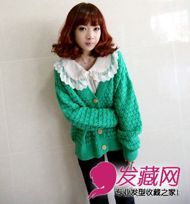偏橘色的红色系染发,配上绿色的毛衣开衫,撞色的搭配非常的出彩。同时蛋卷头也很有韩国女生的感觉。
