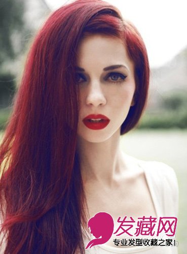 小编点评:如焰火一般的火红色发色再配上红唇,是不是超性感呢?将头发全部放到肩的一侧,显得很妩媚。很有视觉冲击力的一款发型。