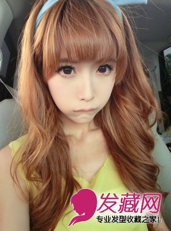 金棕色的染发颜色,给人在一种蜜糖般甜腻的感觉。齐刘海的长卷发蓬松而又饱满,非常的生动。配上可爱的发箍,更是减龄。