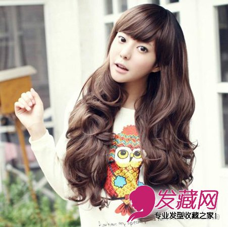 ,深棕色的染发颜色让整体的造型都看起来非常的甜美可人。长卷发可以很好的拉长脸型,斜刘海也是修饰脸型的关键。