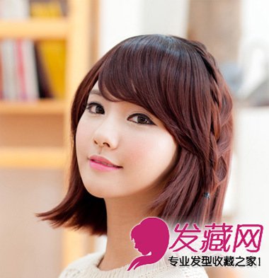 ,发尾稍稍打造外翘感觉,灵动甜美,左侧编利用一股松散的编发点缀,更新颖淑女。板栗色的发色暗淡时尚!