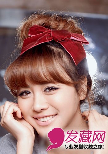 一头棕红色的长发很阳光很甜蜜,在头顶盘成一个松松的丸子头,再加上弧度感齐