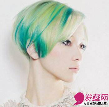 这是一款荧光黄、荧光绿和绿色的挑染色调,张扬个性,短发造型在侧面剪出一个弧度,露出娇小的耳廓,加上素白的妆容,优雅动人。