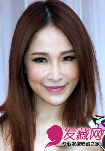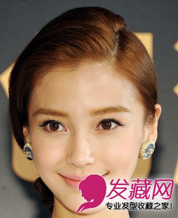 非常简洁的偏分盘发,暖色调的棕红色染发让angela baby的肤色看起来更加白皙,头顶处的蓬松处理是修饰脸型的方法。