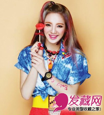 金孝渊长直发造型,重要突出渐染发色和发型设计,发色以深棕色为主,渐染红色、紫色和白色,刘海扎成可爱马尾,突显自身的可爱甜美气质哦。