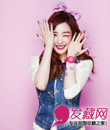 tiffany棕色长卷发造型,性感甜美,以粉色波点蝴蝶结装饰,逆天扮萌造型美感十足,让人惊艳的完美形象哦。