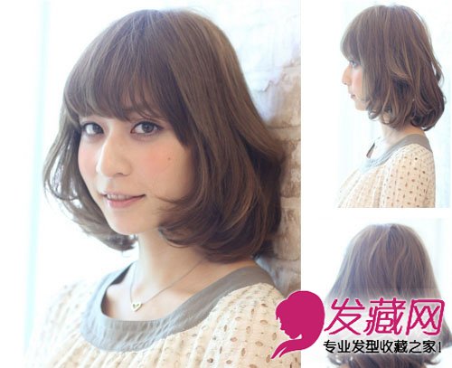 棕黄色的染发造型十分时尚,烫发用了比较规则的波浪卷度,看起来具有弹性且柔顺。前额的齐刘海散发着女生的可爱感。整体造型将头型扁小的困扰一扫而尽。