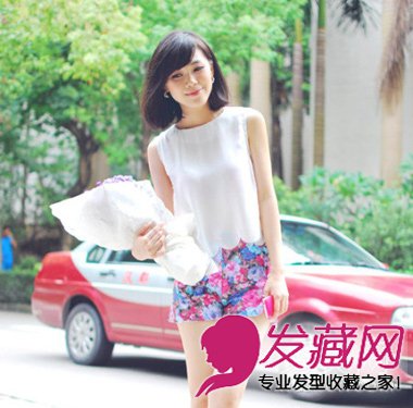 斜刘海自然系简约波波头发型,碎花短裤配白色无袖衫,简单大方