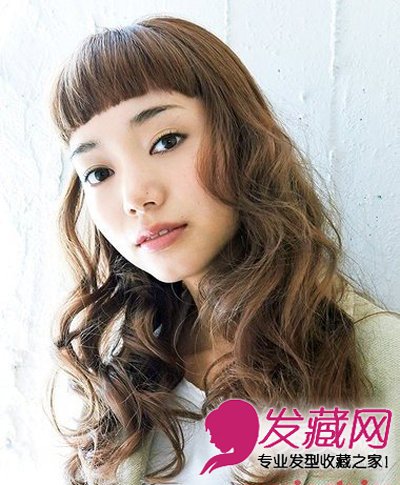 3.cute搞怪卷发正面:这款发型是东京人气沙龙cocoon的招牌发型。下半部分是螺旋大卷的发型,可以修饰脸型,浪漫甜美。而刘海处则和以往的自然式及眉刘海不同,一刀齐的Q版刘海与旁边的大卷自然地融为一体。