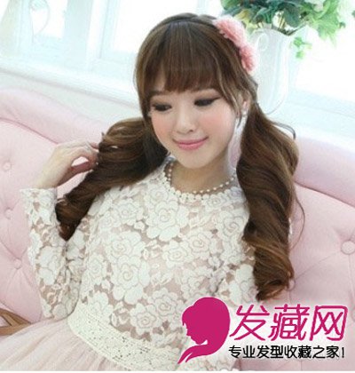 将女生的头发束成两个马尾,马尾处的发丝呈螺旋状,呈一定的卷曲的弧度,显得十分的有层次感,整齐的刘海衬得女生的脸型十分的娇小可爱,头上两朵花的点缀,为整款发型增添了一丝美感。