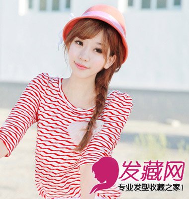 这是一款韩式侧边编发,简单的扎法,自然的造型让你在打造出时尚感的同时不会显得太刻意,配上红色的帽子,甜美清新,很适合约会哦!