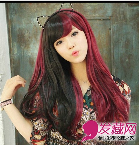 把黑色的卷发挑染大片的酒红色发色秀发,自然中带着红酒般的浪漫,这样的发色更能衬托你白皙的肌肤,搭配可爱发箍让你造型更加可爱。
