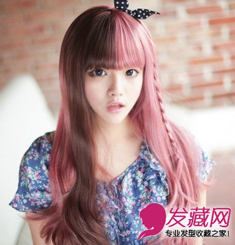 栗色卷发搭配吸睛的粉红色染发,各占一半的染发布局让你的造型充满个性新鲜感,发尾微微的卷曲带出女生俏皮可爱气质,一条小小的麻花辫为造型增加一点活力。