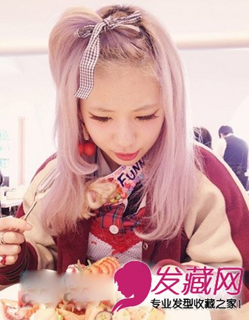 一款可爱的苹果头造型,简单的将刘海以上的发丝全部扎起来然后一款亚麻灰色的发色更显出一种清爽与时尚感,浅紫色的发色与个性的对登更显时尚感,粉嫩的发色与可爱的发型搭配起来显露出时尚感。