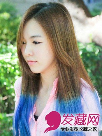 搭配浅棕色与海蓝色的双色挑染,时尚个性的染发很有减龄的效果。
