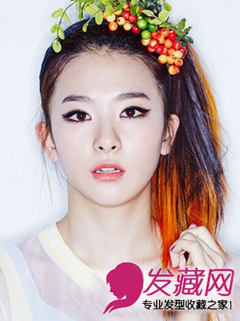 这款挑染发发型一样是潮流女生们的最爱,露额的高马尾扎发清爽利落,搭配橙黄色染发的顺直长发更添清新活力的少女气息。