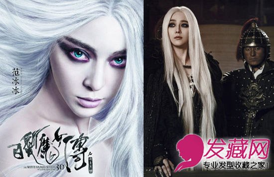 在《白发魔女传之明月天国》中,范冰冰一头飘逸的长直白发成为整部戏的亮点,银白色的发丝加上精致的烟熏眼影,鬼魅妖气,蓝绿色瞳孔透出魔女的野性与灵气。范爷的眼睛抹上烟熏妆后怎么有种摇滚朋克的感觉呢,不过白色的中分长直发与黑色系的装扮形成对比,显得妖气十足。