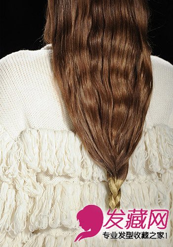 除了几簇染发夹杂在单一底色中显得创意十足,在发梢处进行局部染发也是最新的流行元素。波浪质感的长发下,用不同色泽的局部金色染发扎成发尾麻花辫,优雅而时尚。