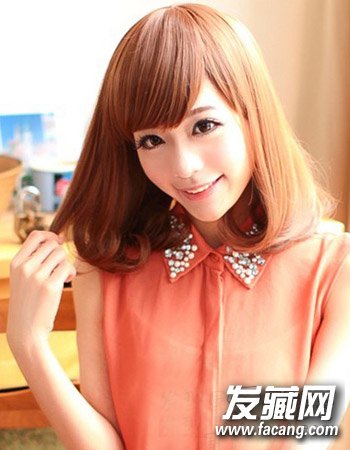 同样是一款斜刘海式的女生中长发梨花头发型,配合这种棕红色的染发更显女生的可爱粉嫩感,而斜刘海的造型与内扣式的发梢烫发还显小女生的俏皮感。