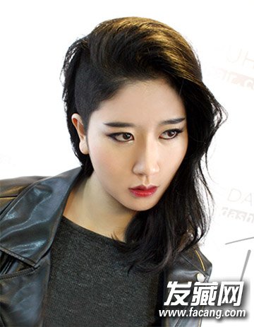 这是一款女生大背头发型,左边的发丝剃的很短,黑色的长发被掳到一边,很是个性。