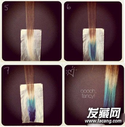 图7:在靠近发梢的1/3的位置再抹上深蓝色染发膏。这样能达到,金色、浅金色、淡蓝色、深蓝色的渐变效果。并以同样方法给其他头发抹上浅粉色和玫粉色。