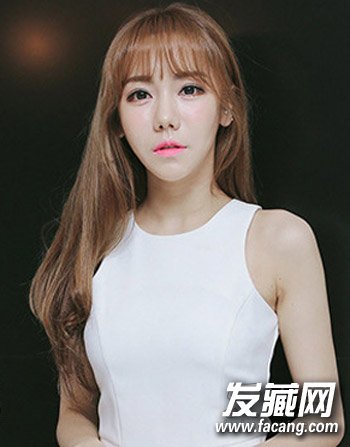 清新的空气感刘海造型设计可是最显女生的清新灵动感的了,配合这种清新飘逸的及腰长发设计与时尚的发梢微烫造型,卡其色的染发设计更添十足清新淑女风。