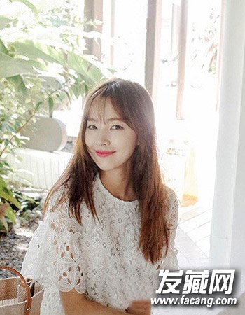 很显清新田园风式的一款时尚女生直发染发发型,飘逸的长直发造型设计再配合这种简单的深棕色染发相搭,简单的空气感刘海造型设计更添的清纯气质感。
